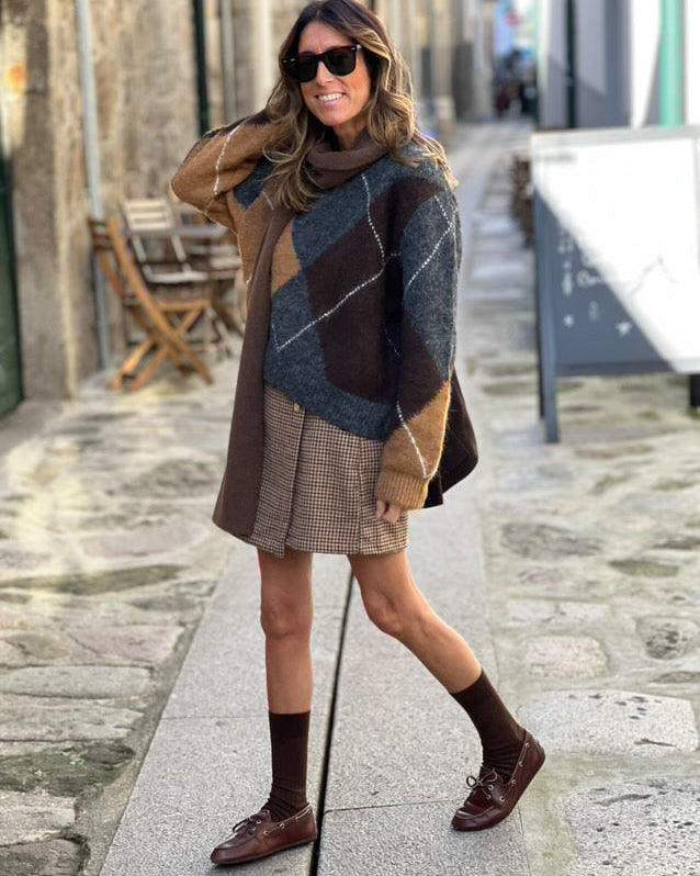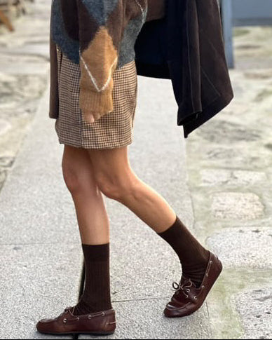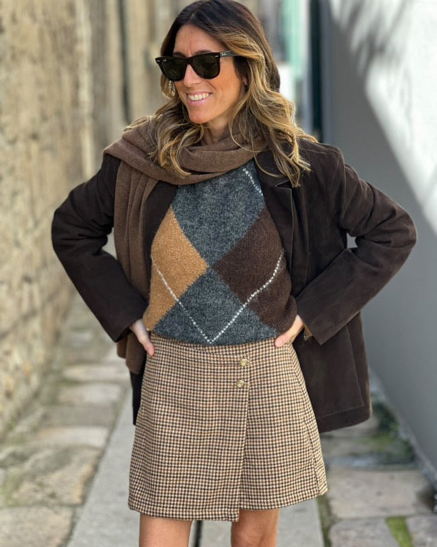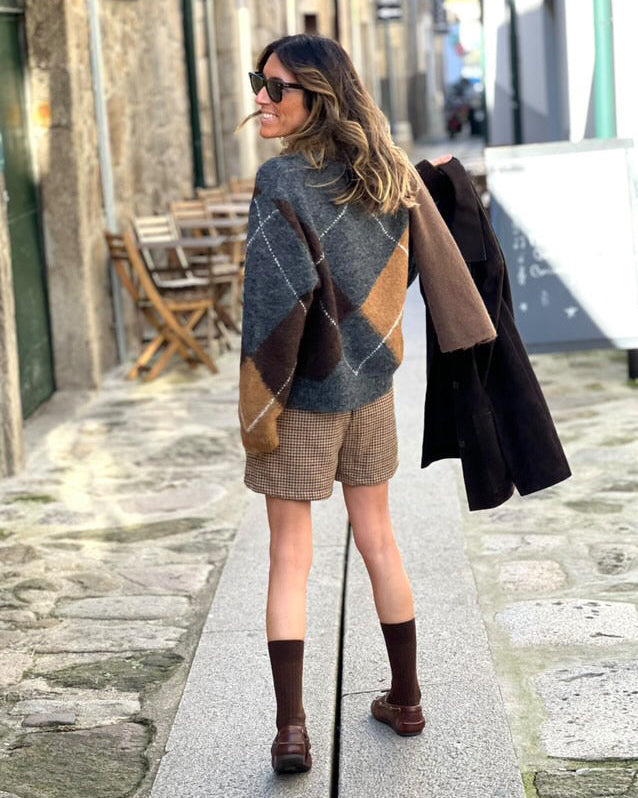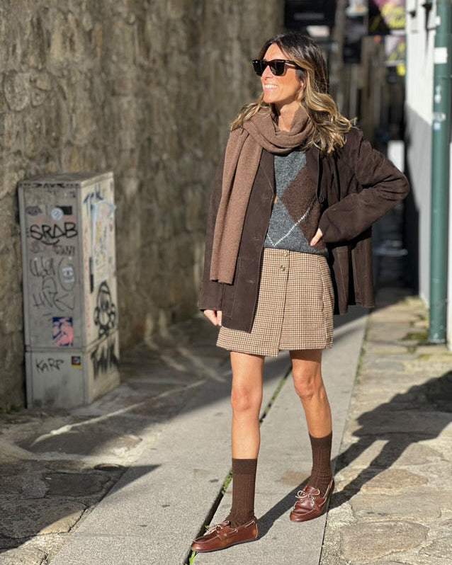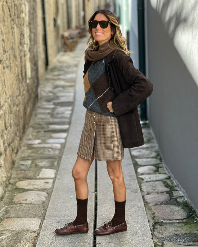 Saia- Calção com fecho lateral. Cintura subida.