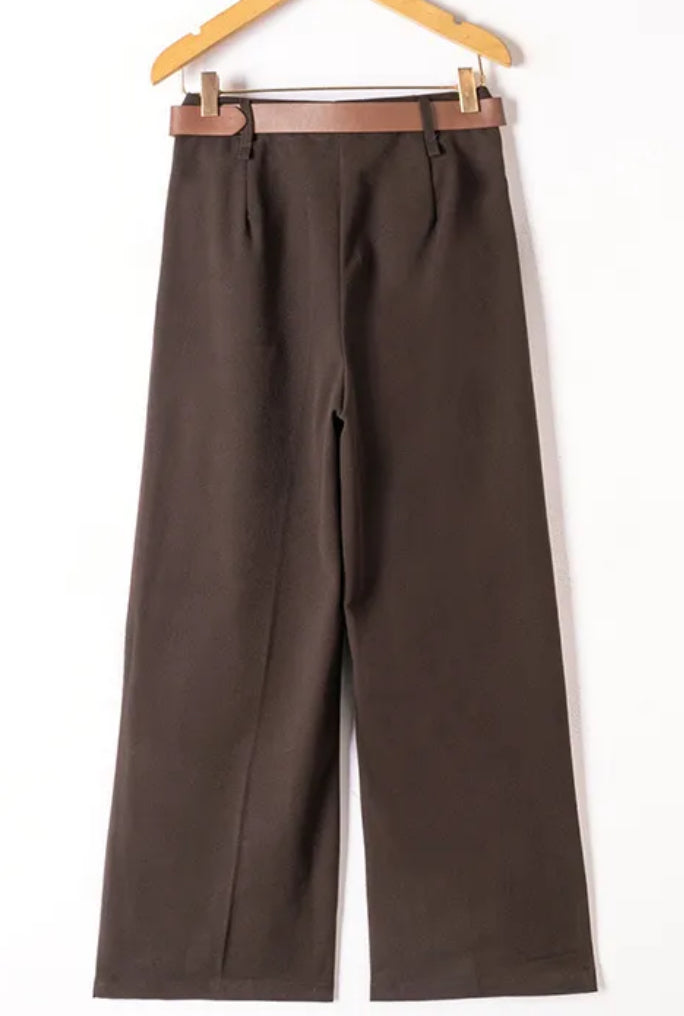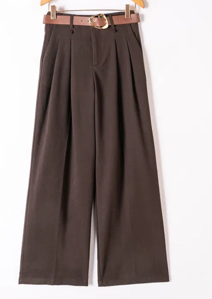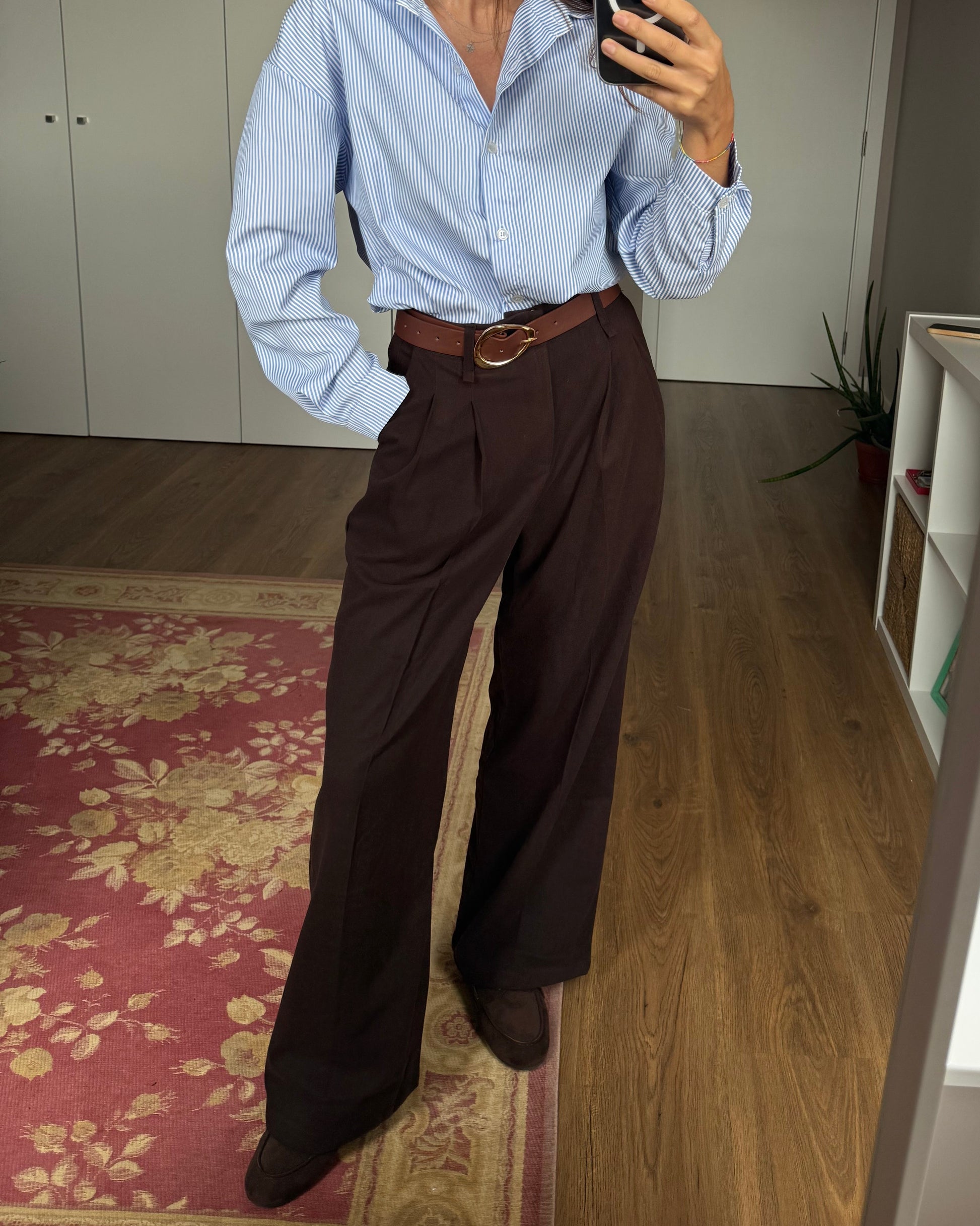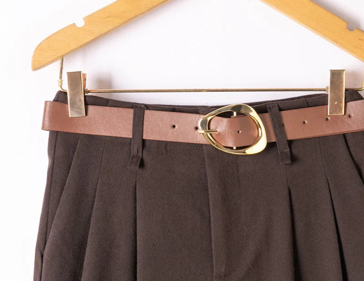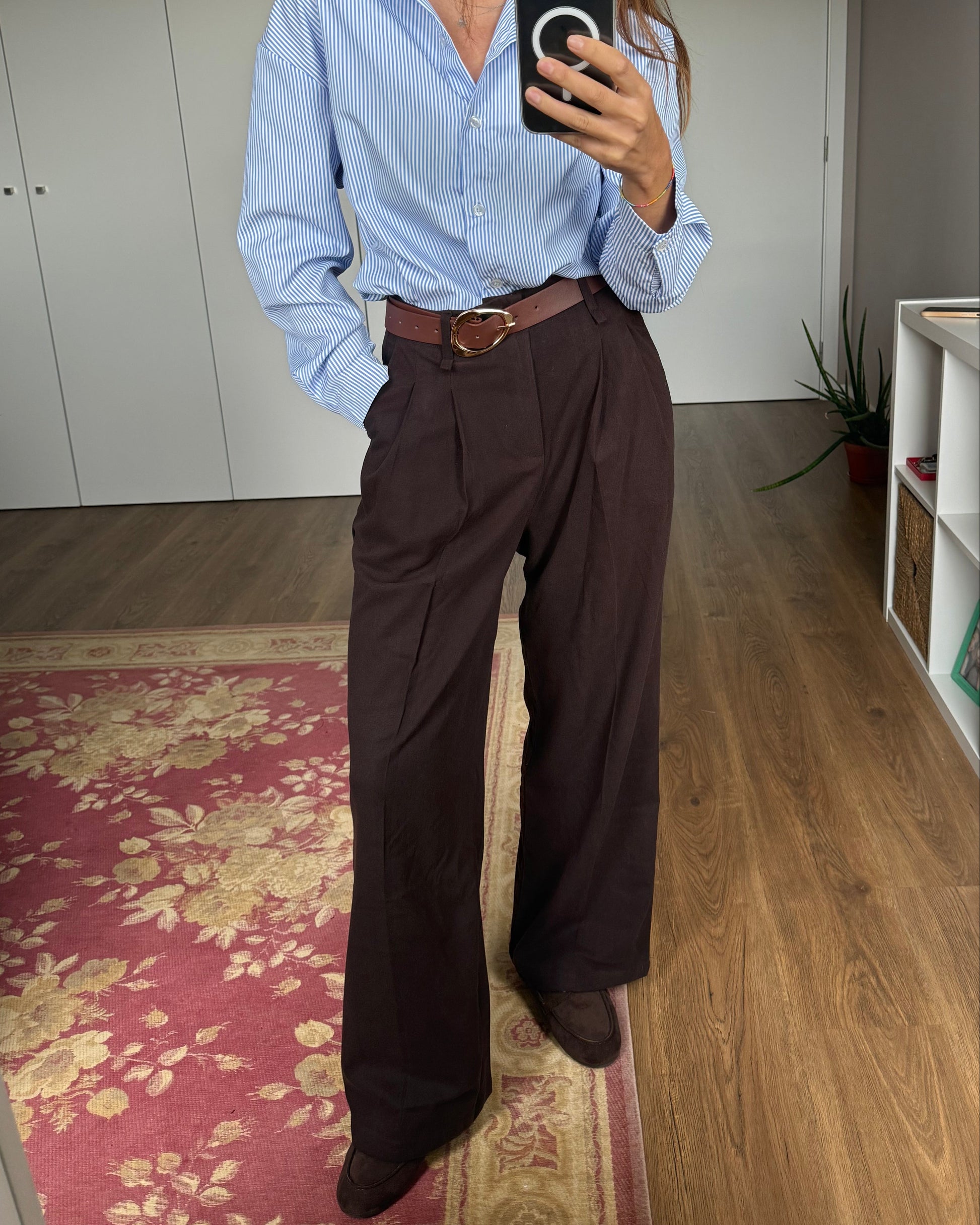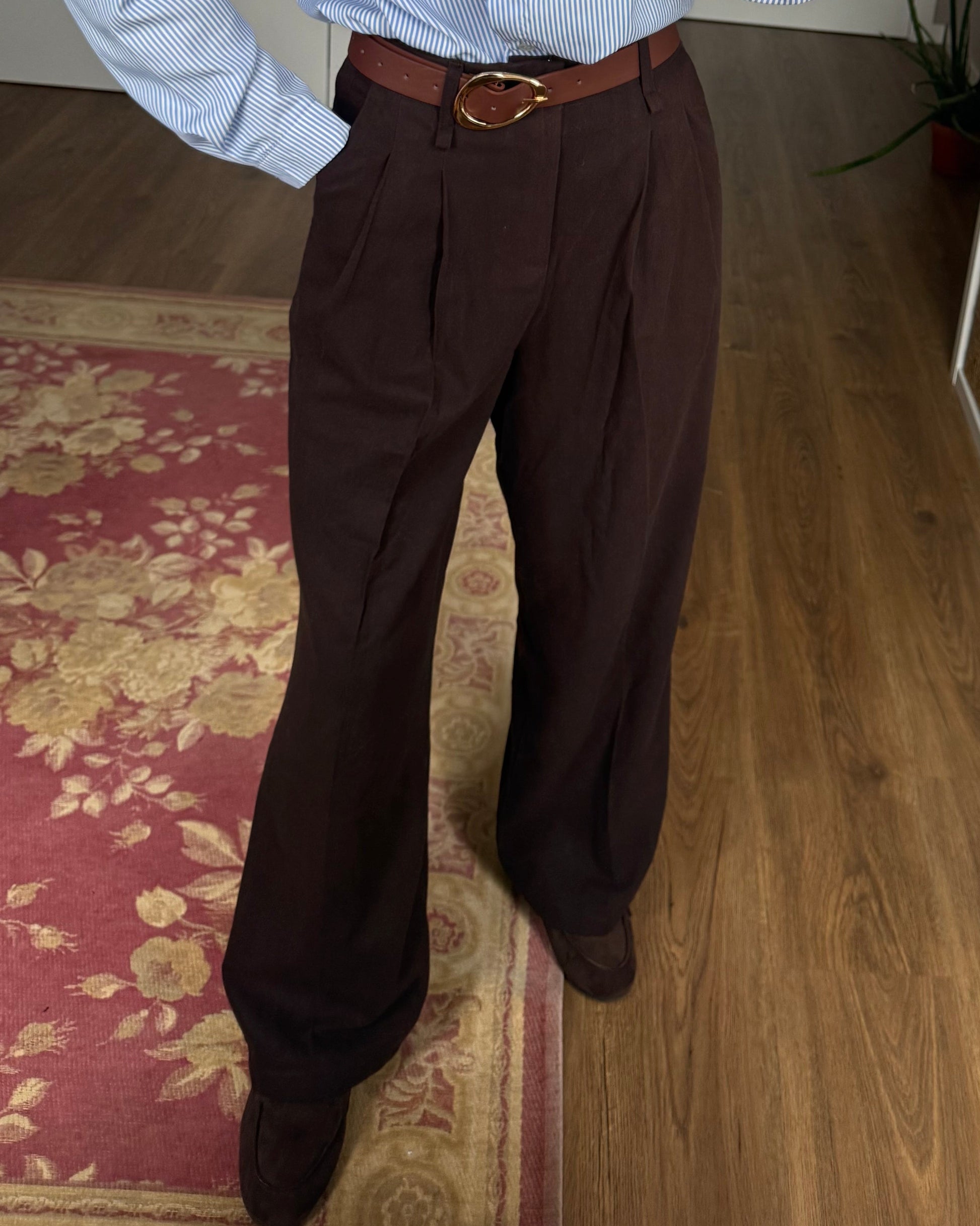 Calças de Alfaiataria com corte elegante. Cintura subida. Perna larga. Cinto castanho incluido.