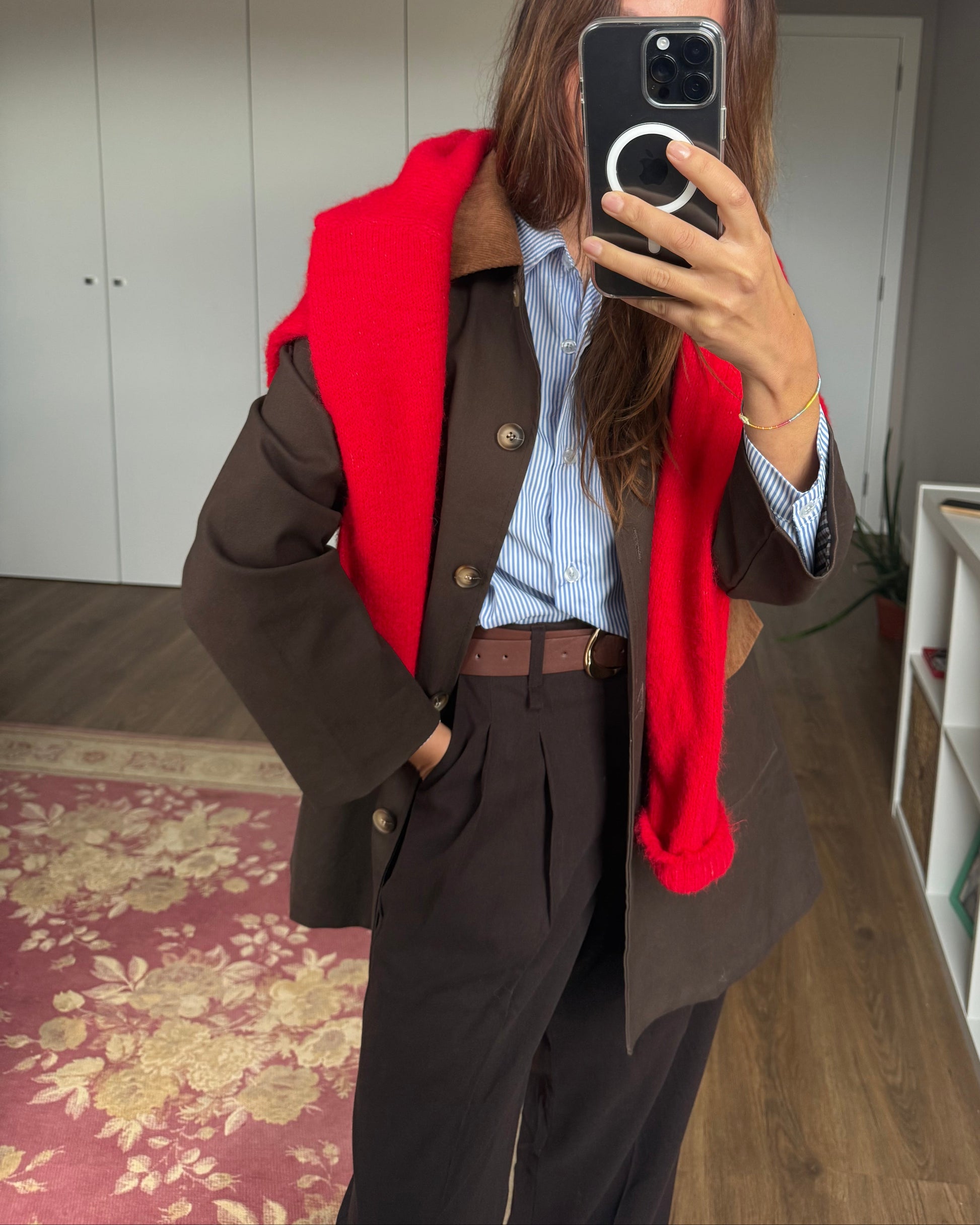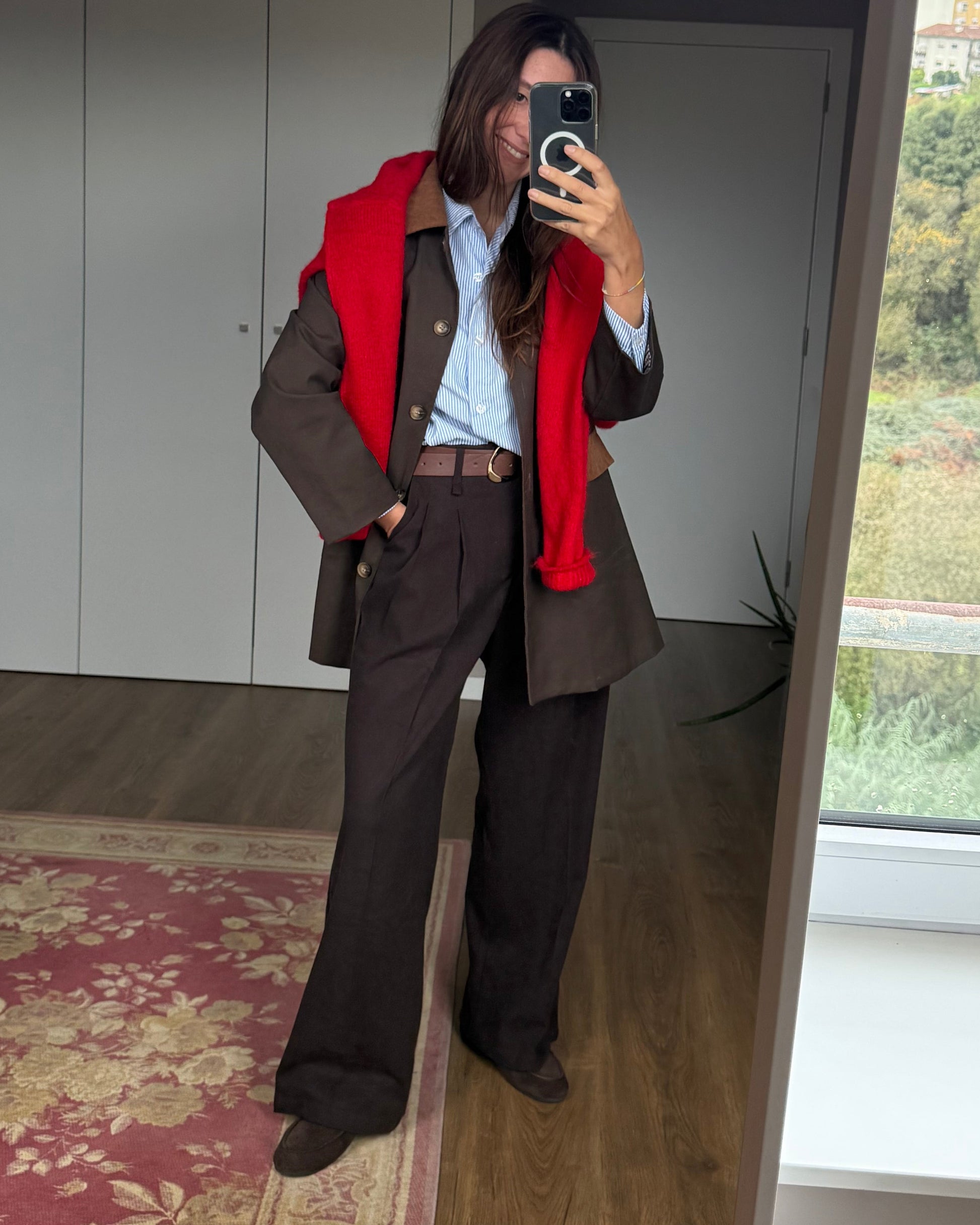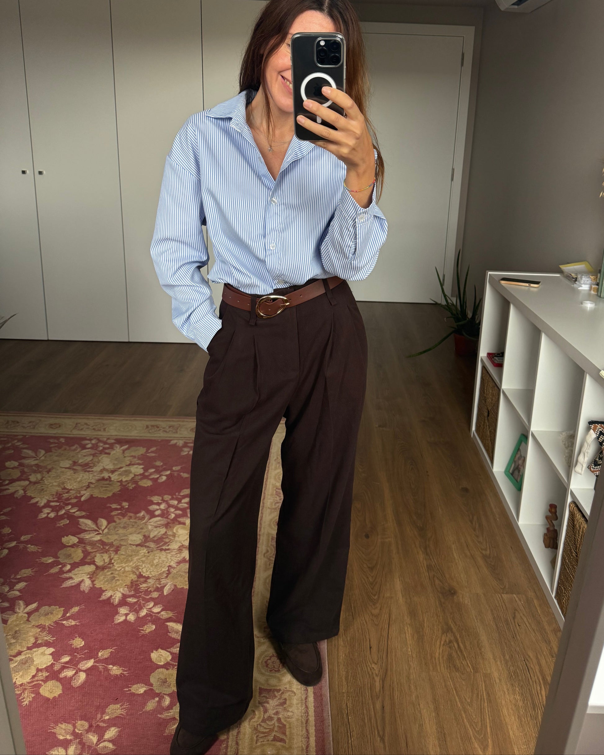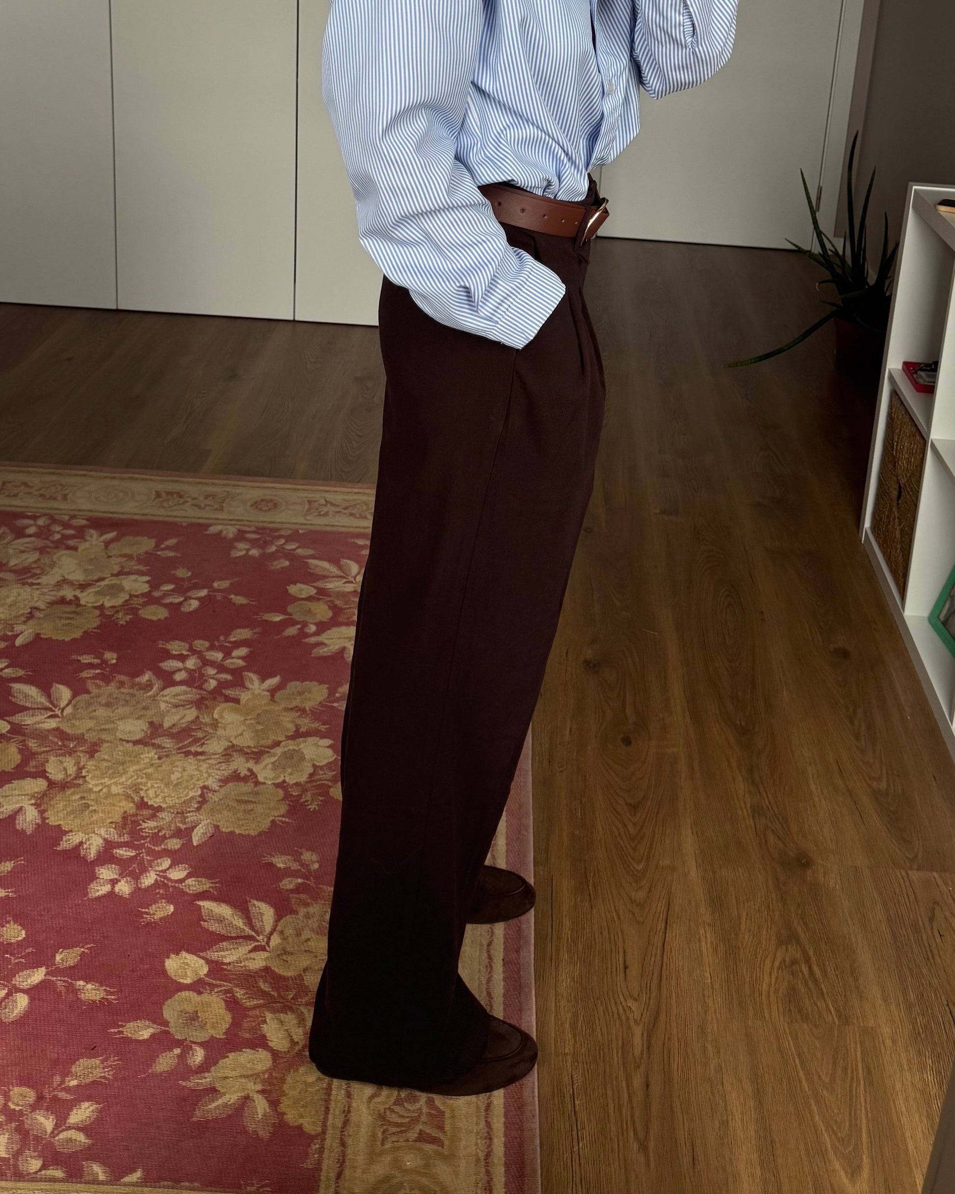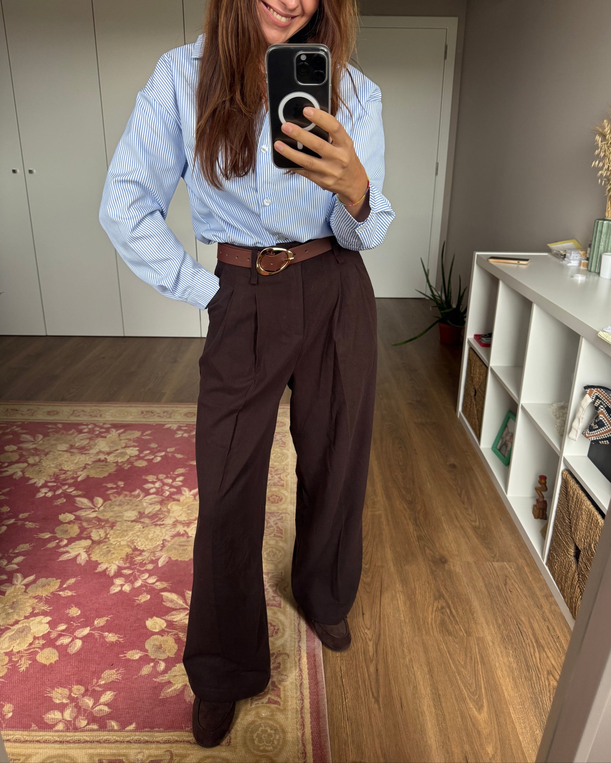 Calças de Alfaiataria com corte elegante. Cintura subida. Perna larga. Cinto castanho incluido.