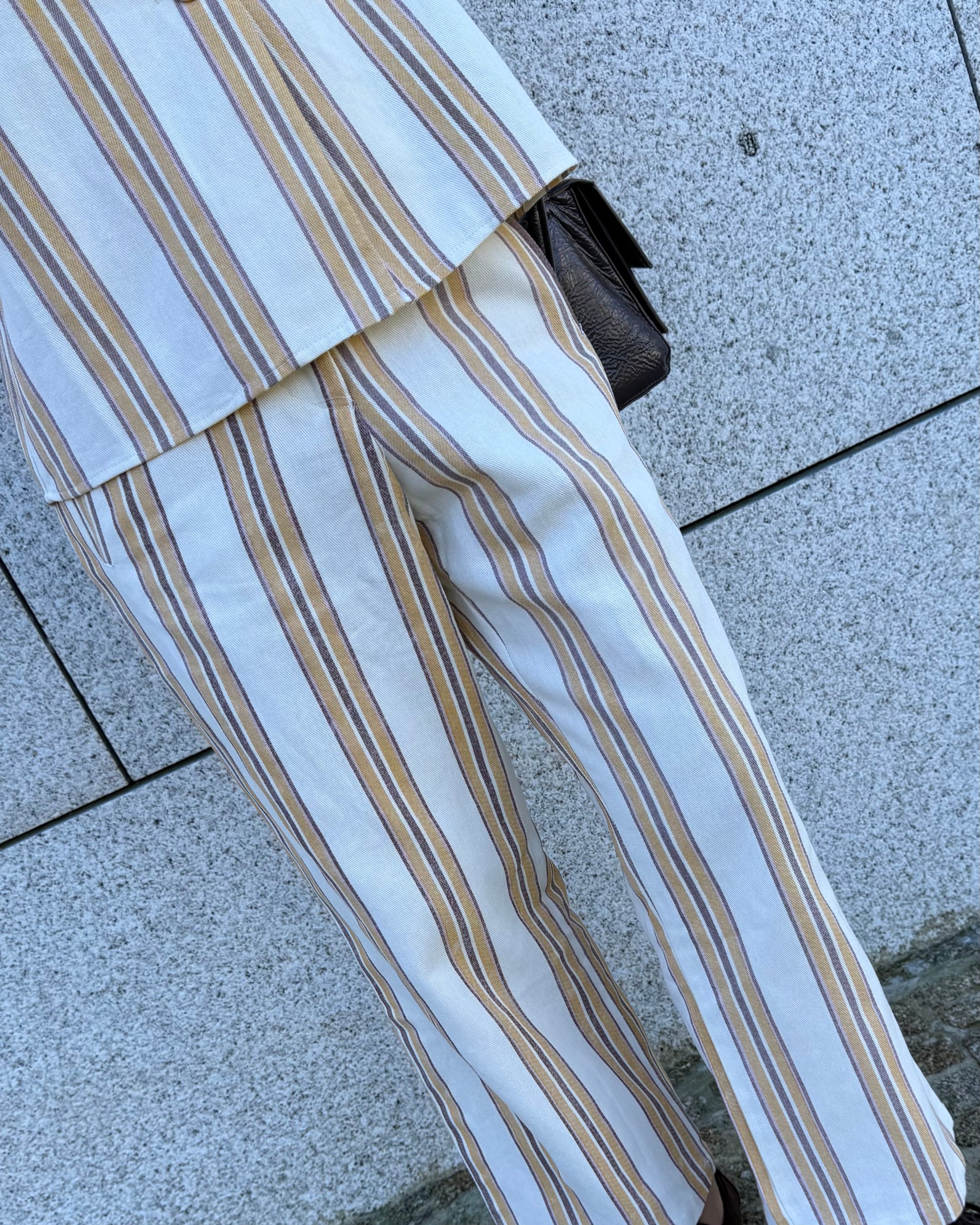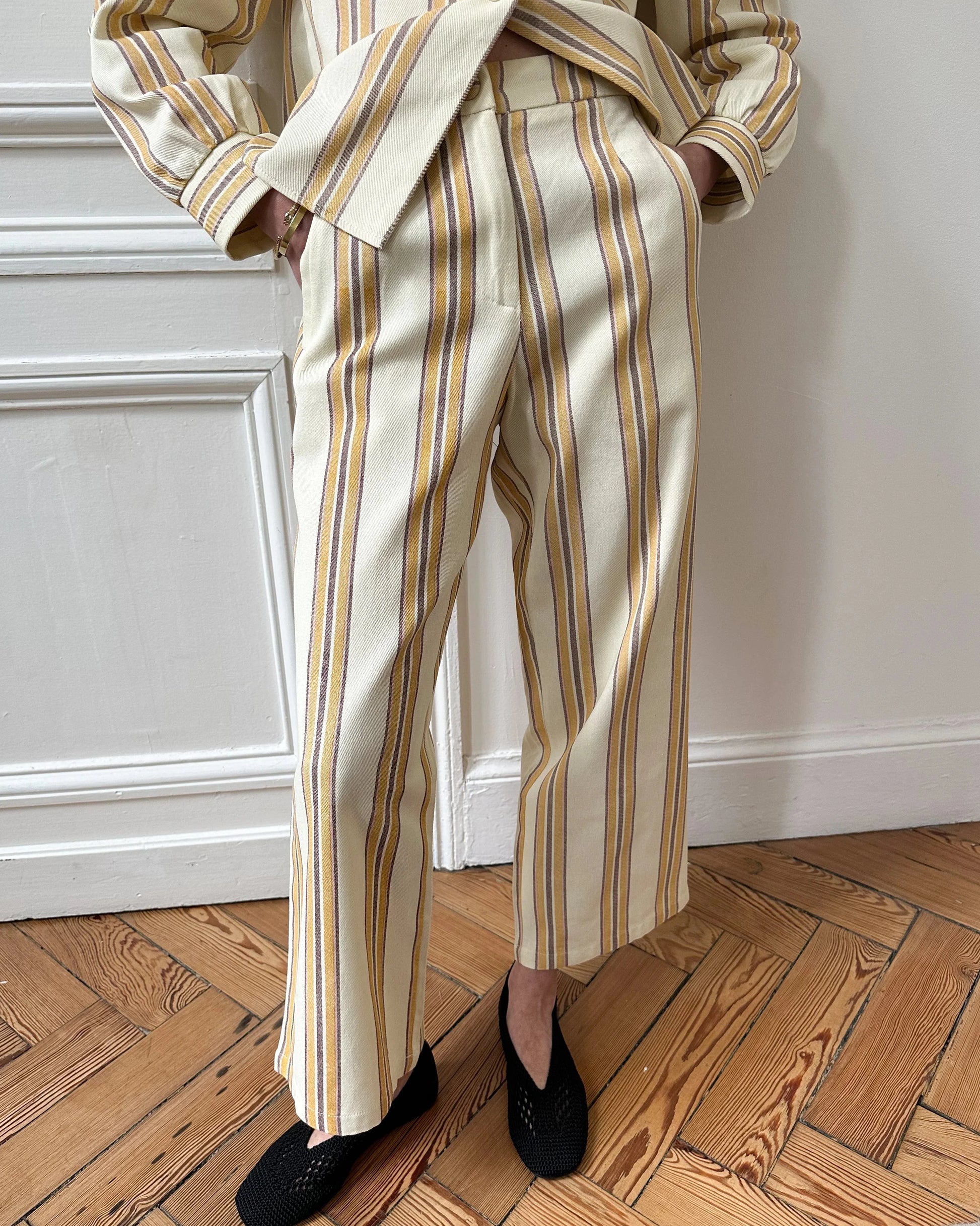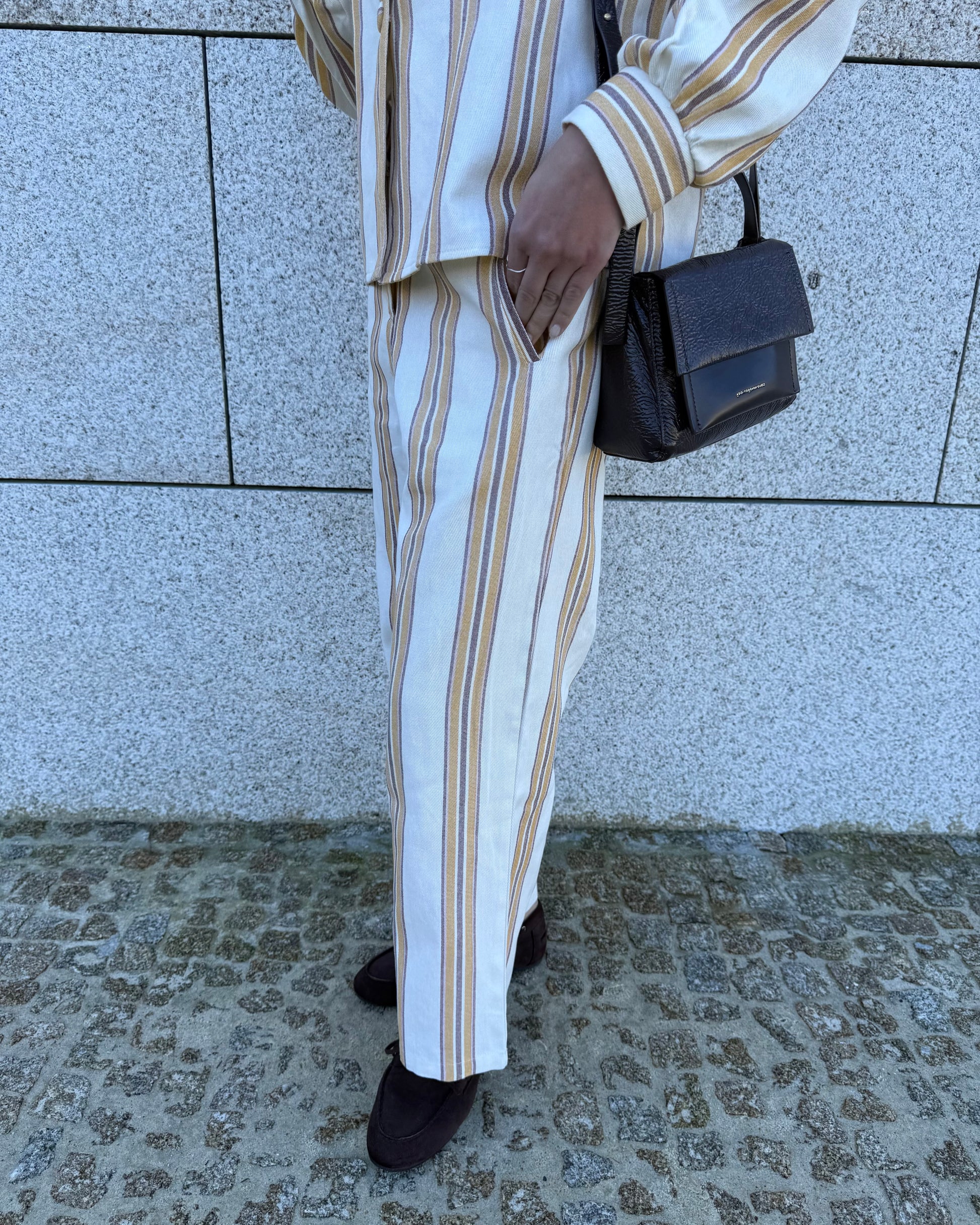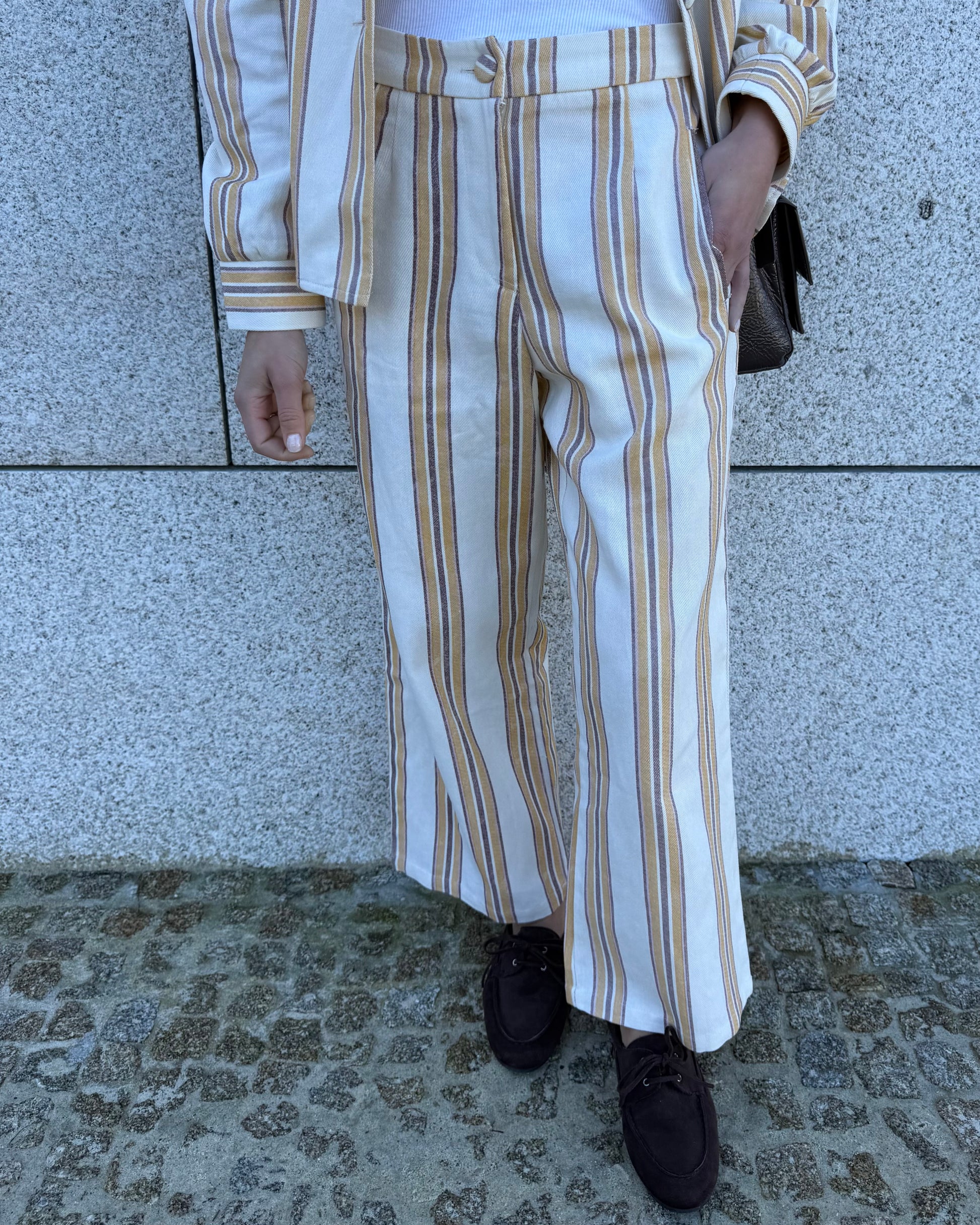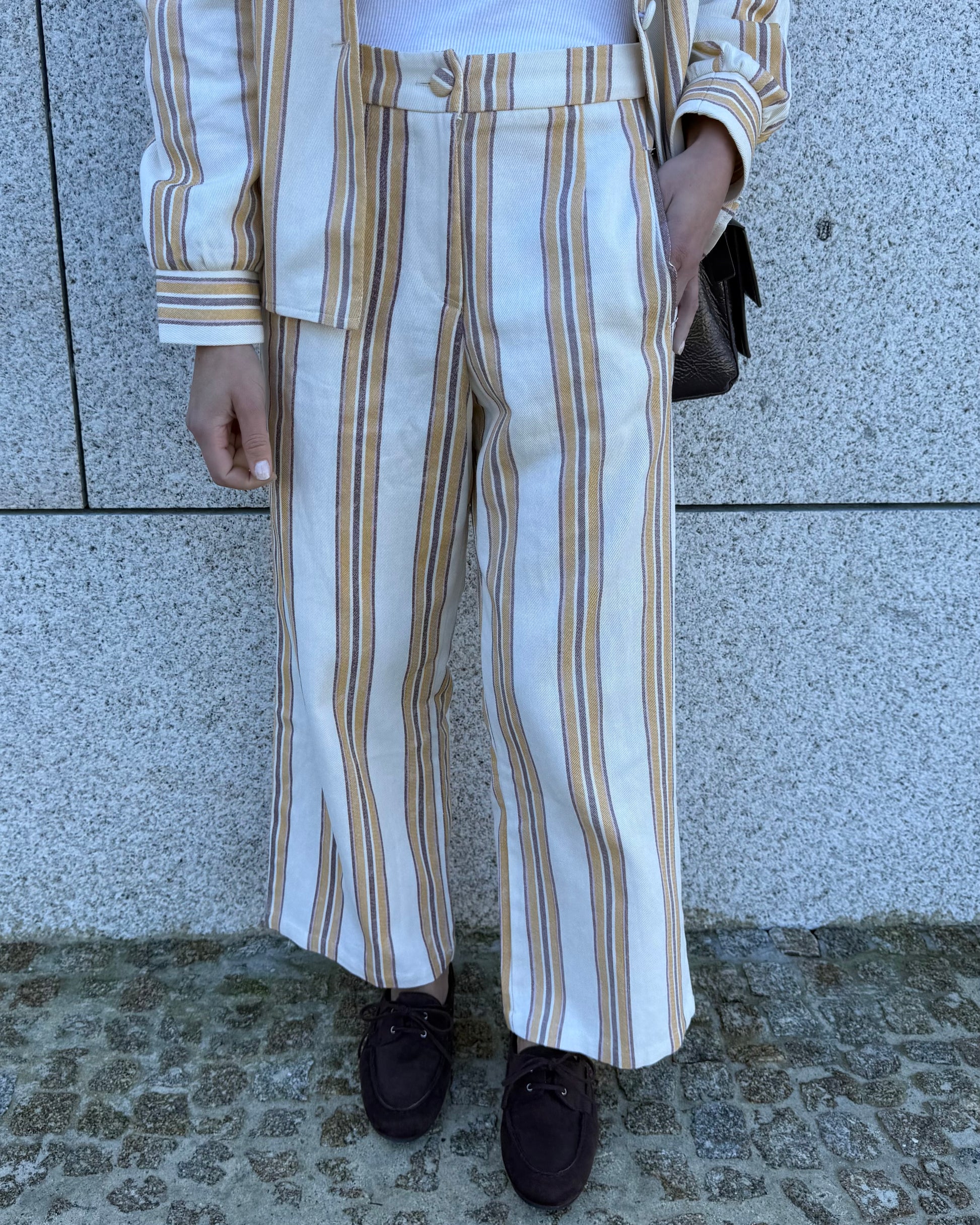 Calças com tecido estruturado. Ideal para usar em conjunto mas também separadamente.