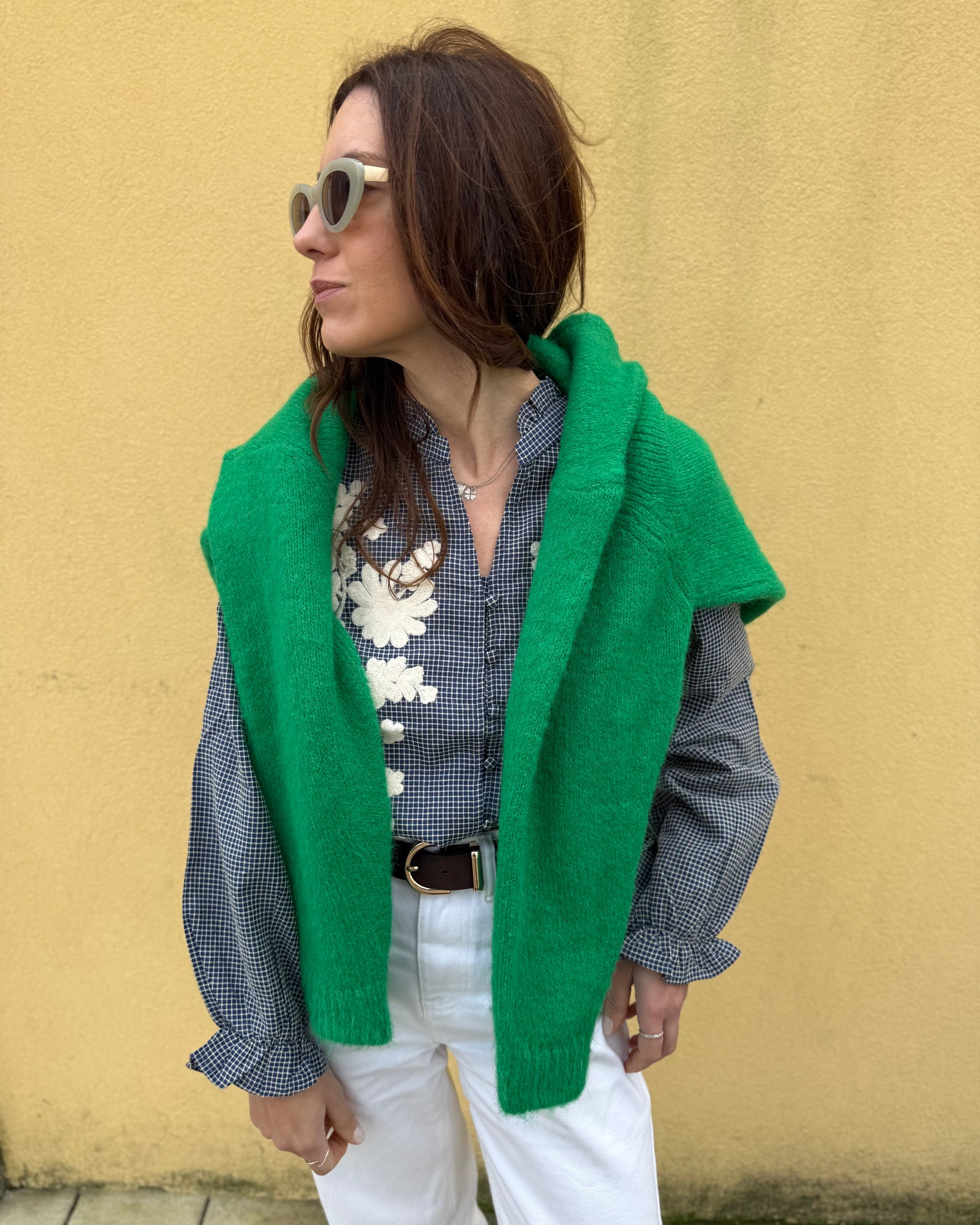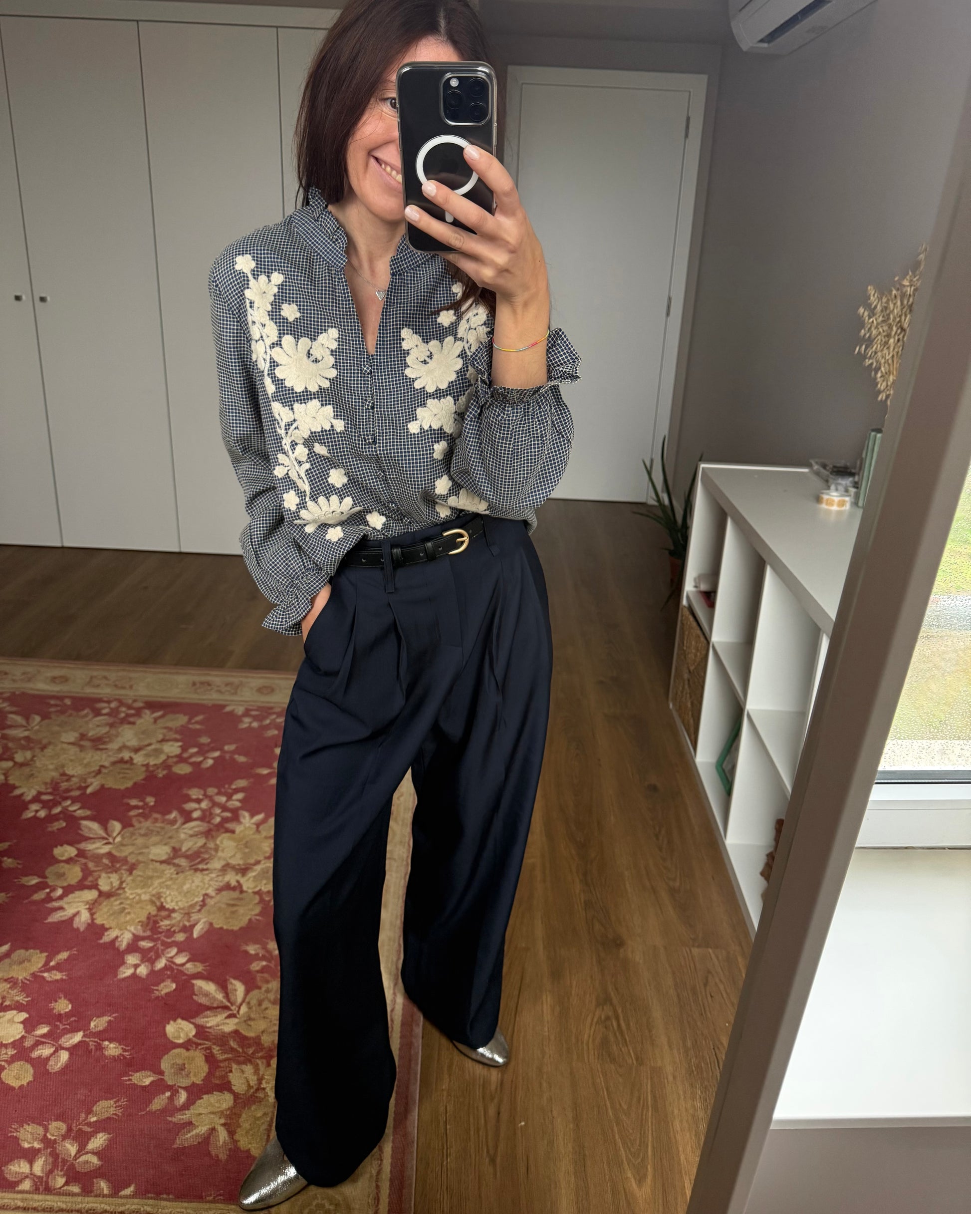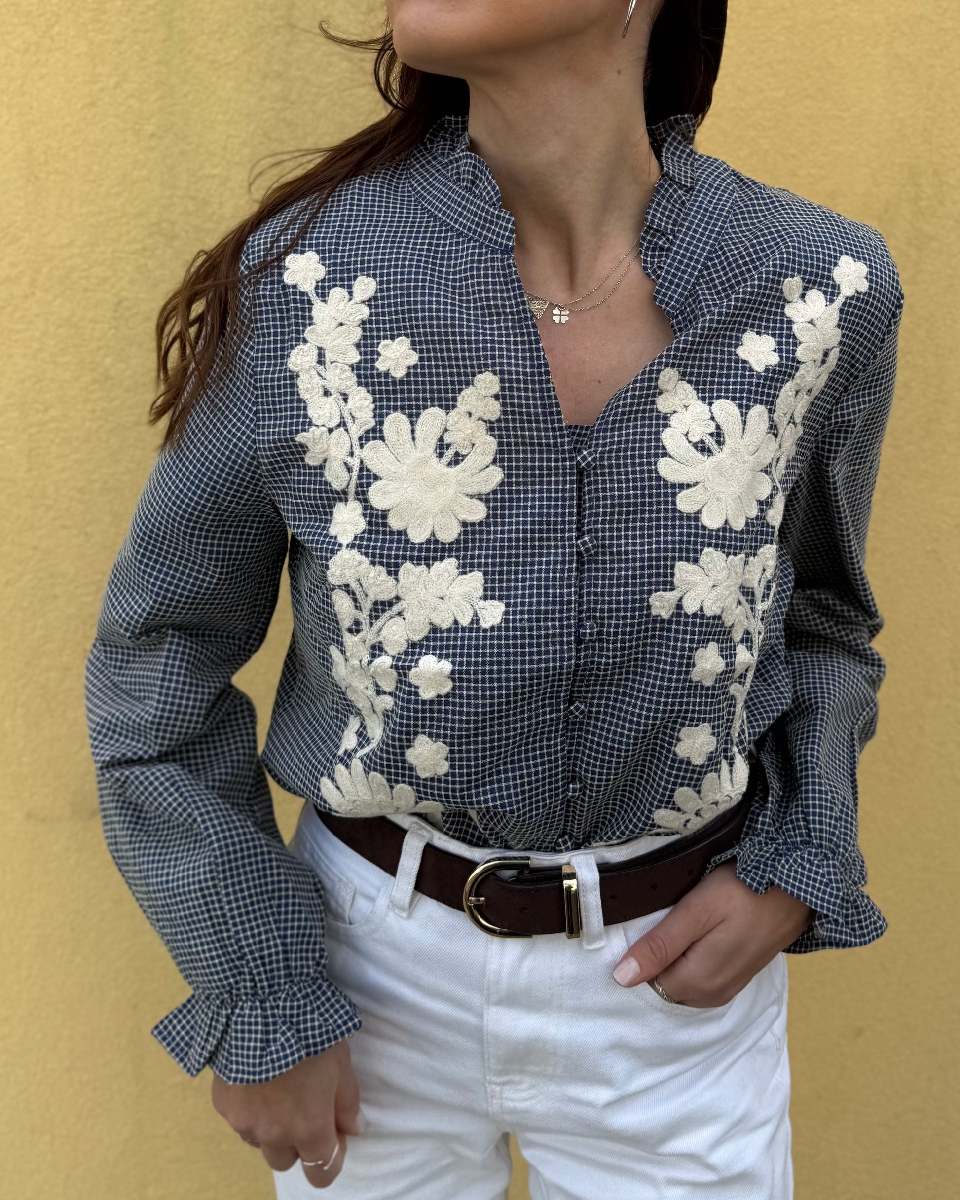 Camisa com estampado de quadros e detalhes bordados.