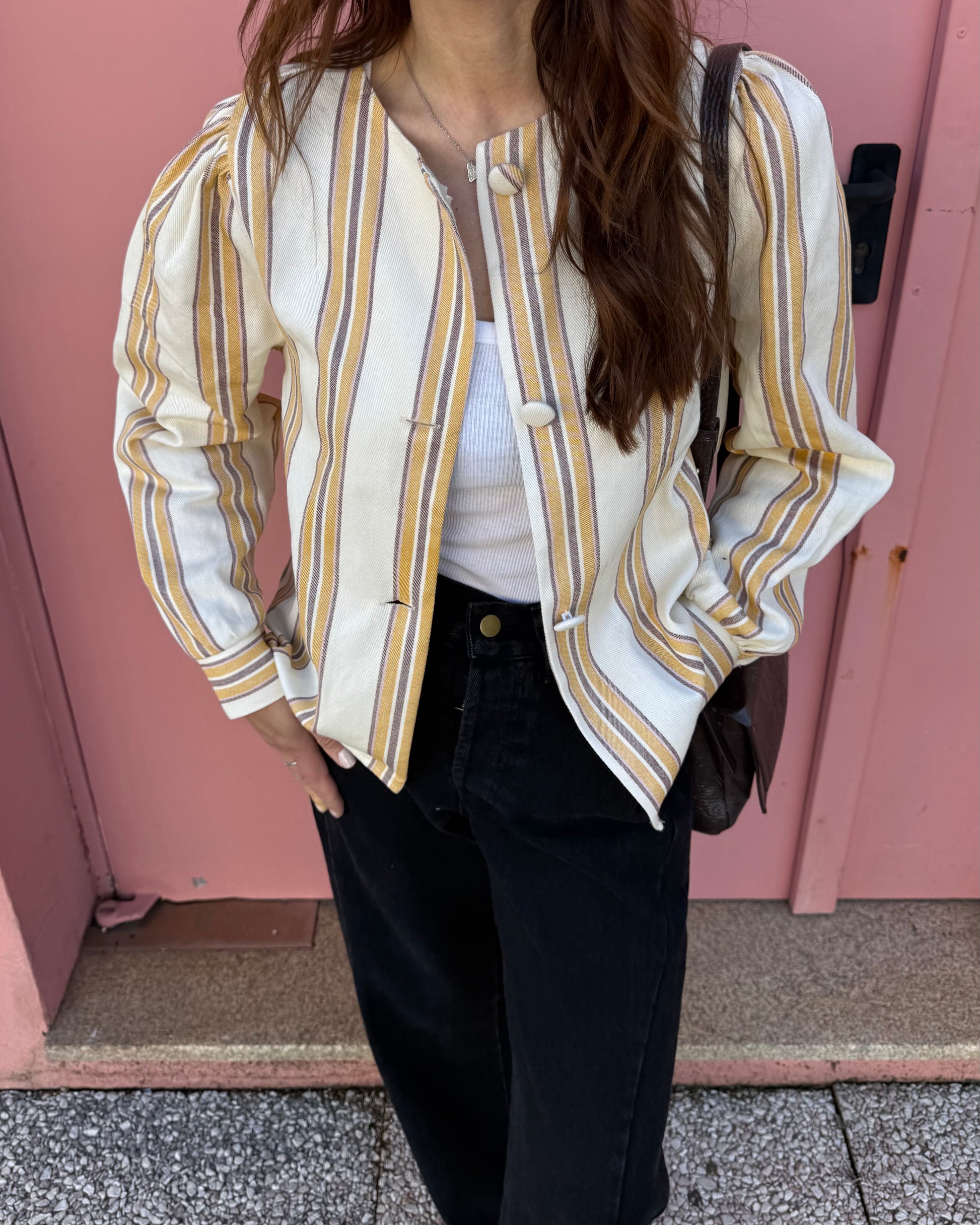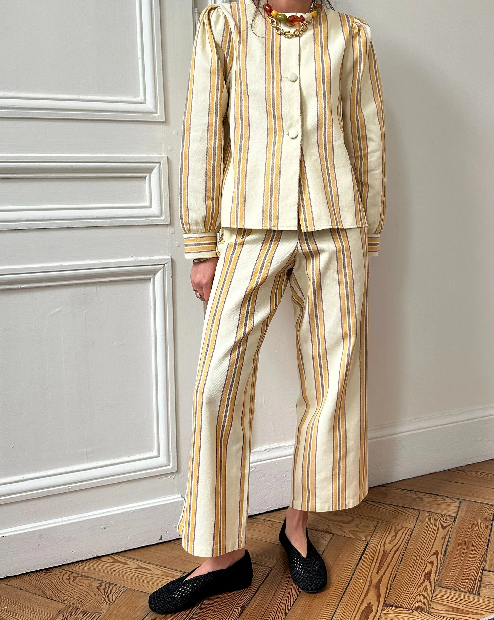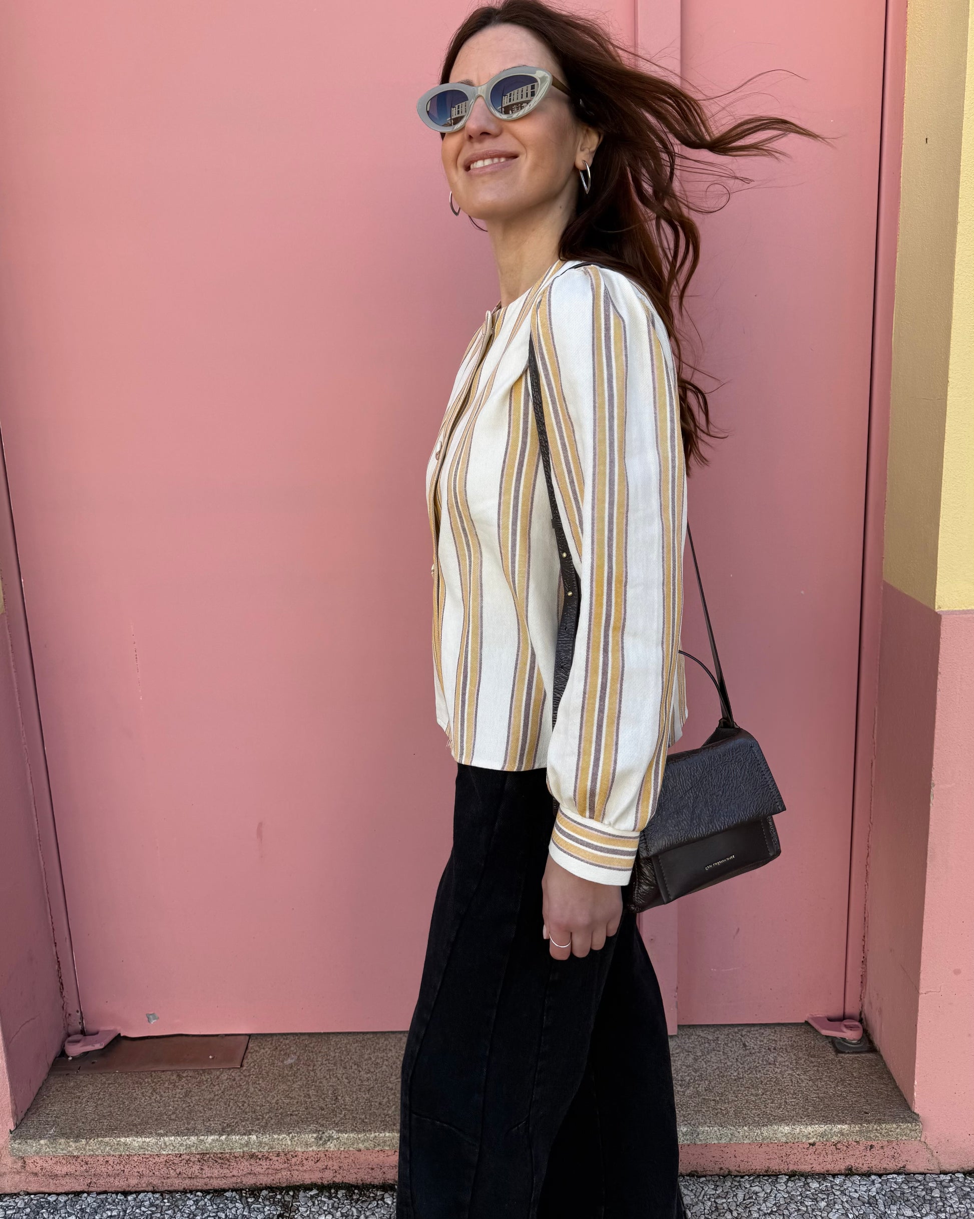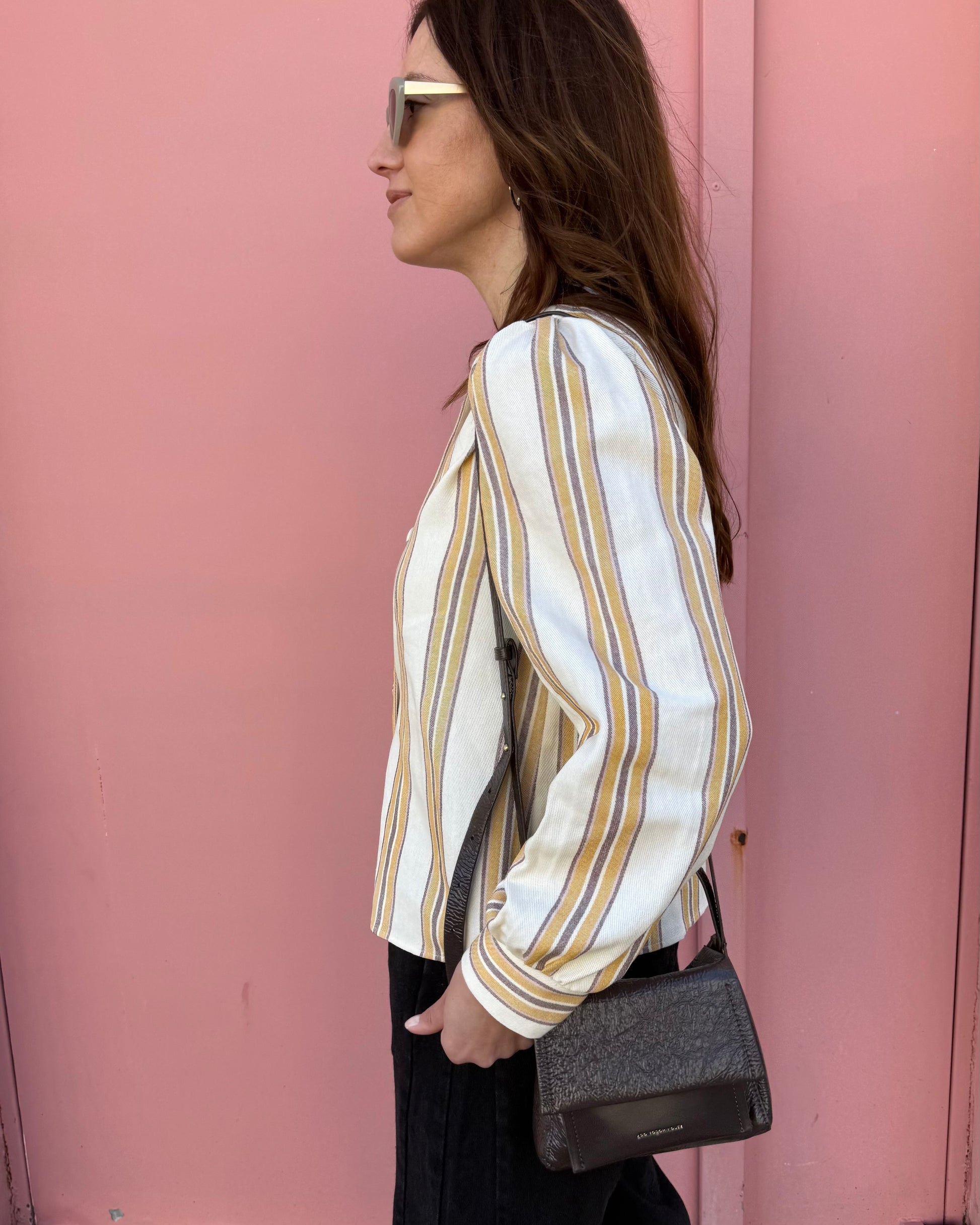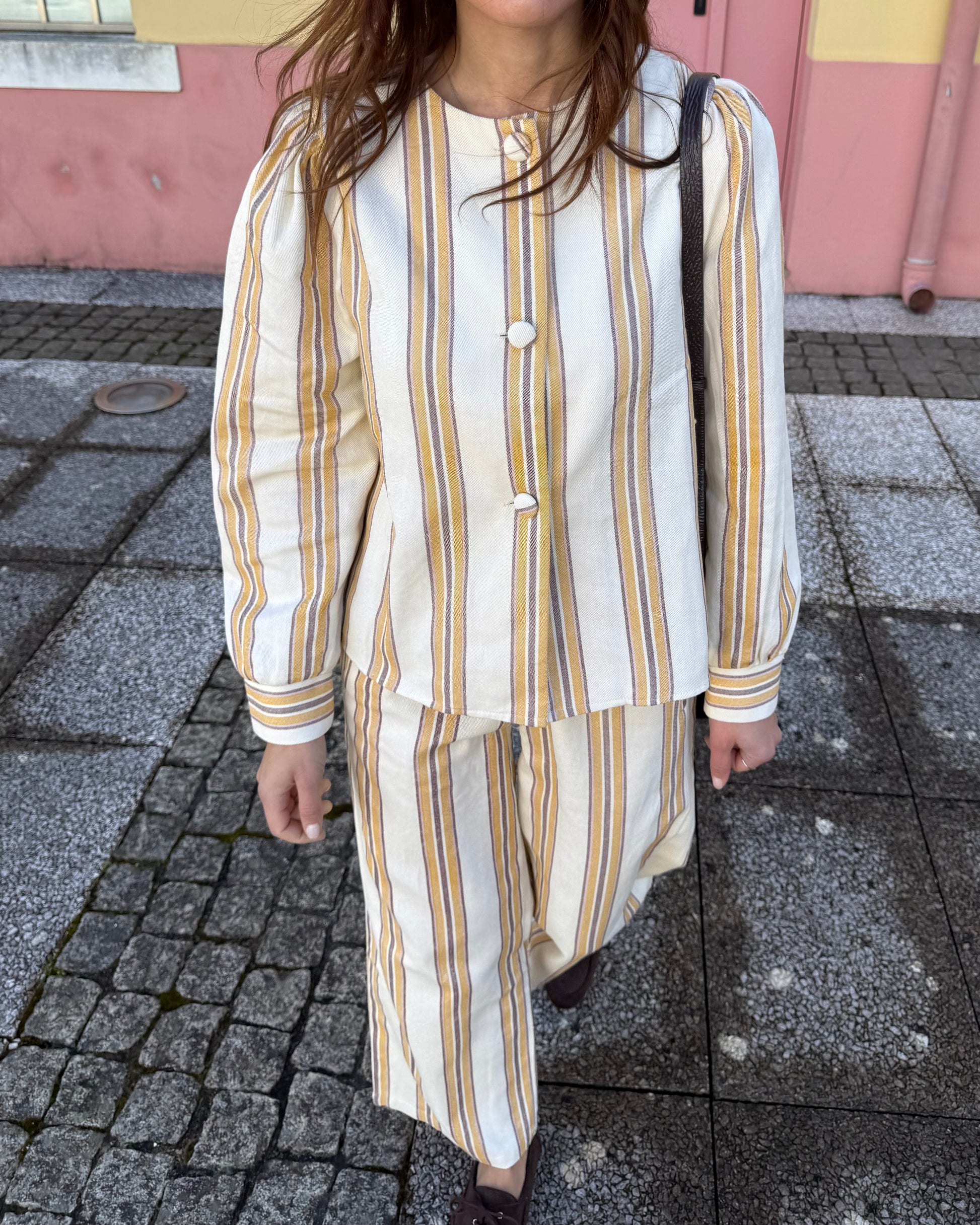 Camisa com tecido estruturado. Botões forrados com o mesmo tecido.