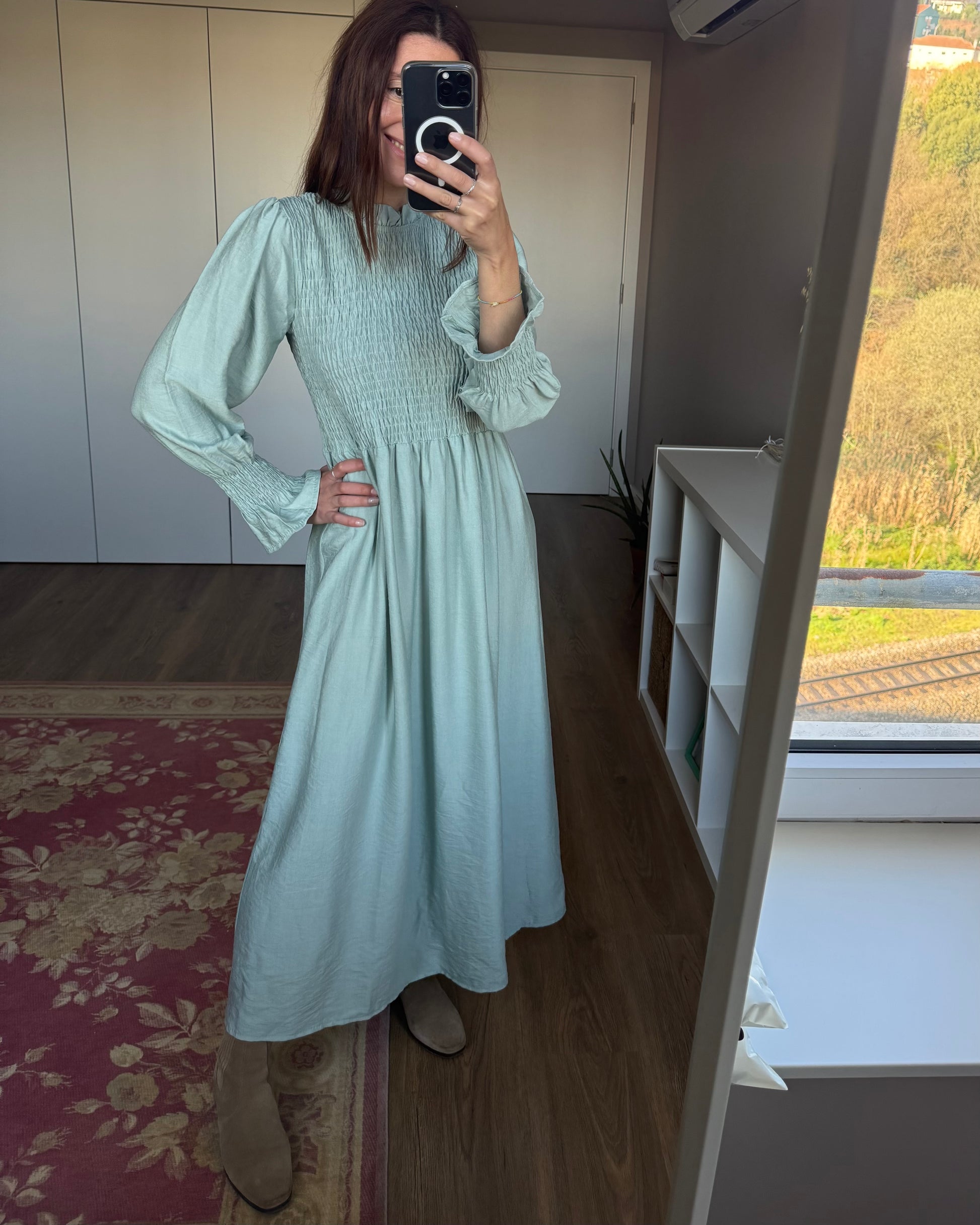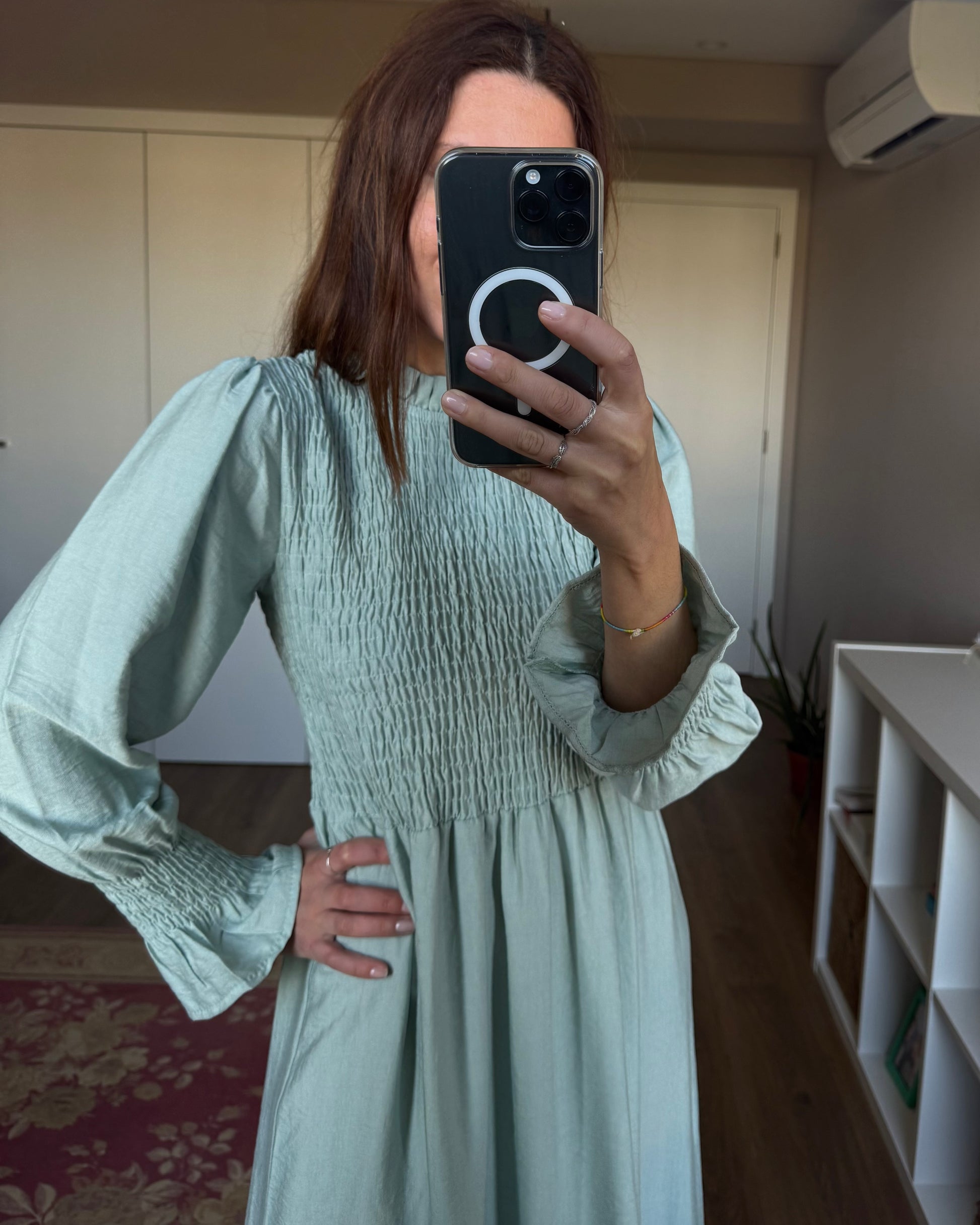 O tom verde sereno transmite frescura e elegância natural — ideal para ocasiões especiais, encontros demorados ou simplesmente para se sentir bonita sem esforço.