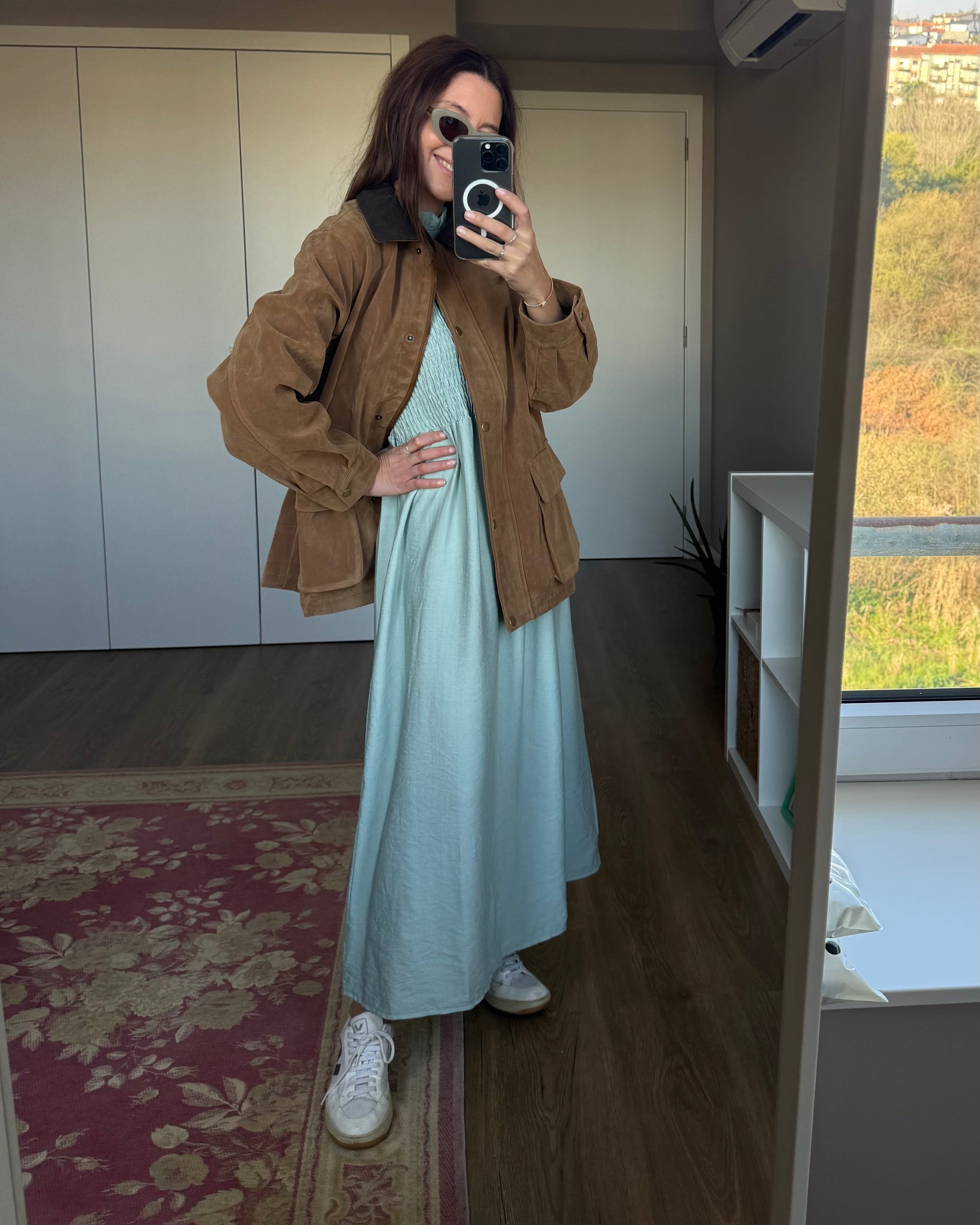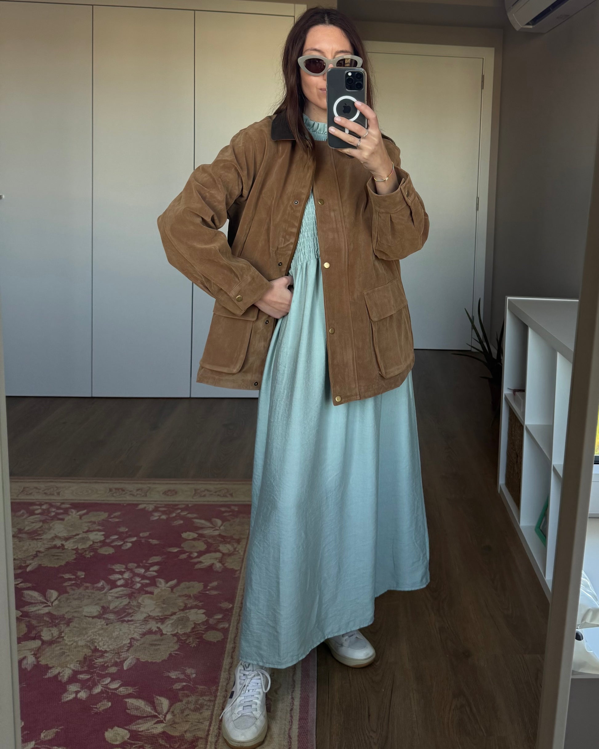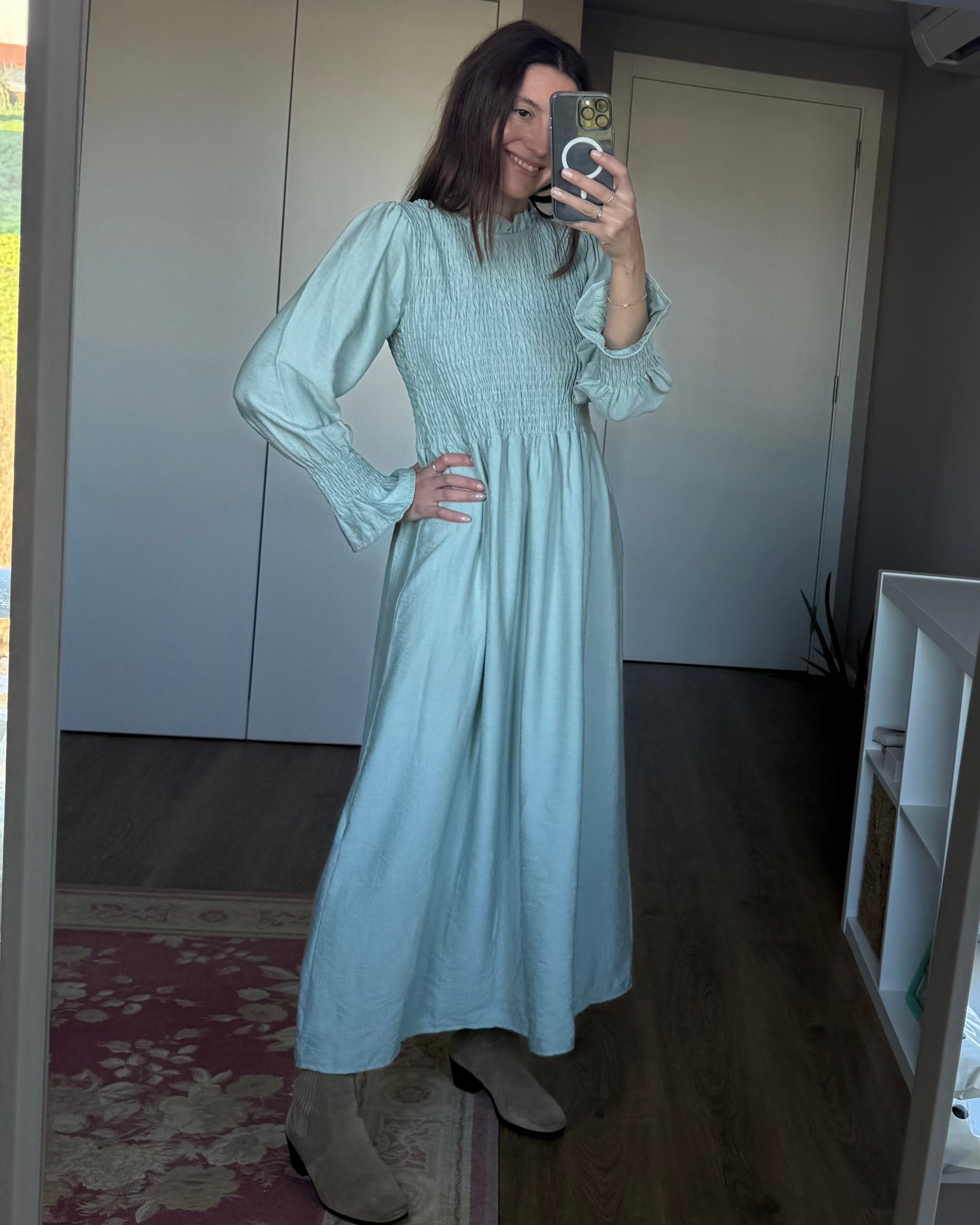 Com busto delicadamente franzido que valoriza a silhueta e saia fluida que acompanha o movimento do corpo, ele traz equilíbrio perfeito entre conforto e sofisticação. As mangas longas com acabamento suave reforçam o charme feminino da peça.