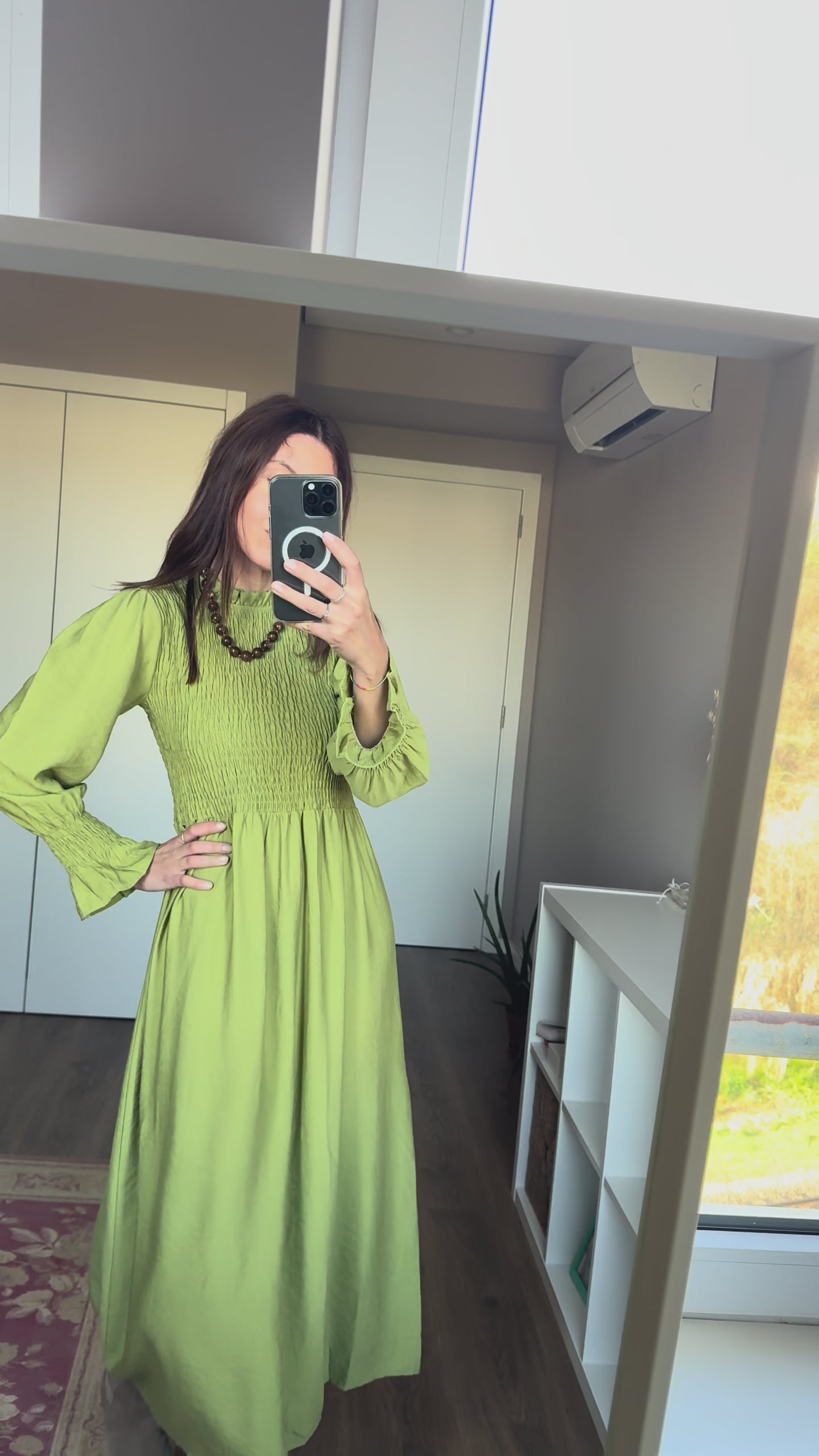 Com busto delicadamente franzido que valoriza a silhueta e saia fluida que acompanha o movimento do corpo, ele traz equilíbrio perfeito entre conforto e sofisticação. As mangas longas com acabamento suave reforçam o charme feminino da peça.